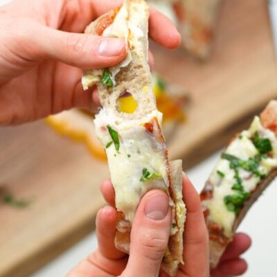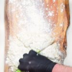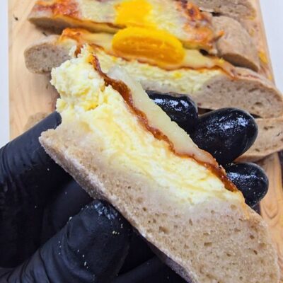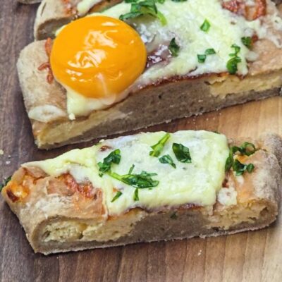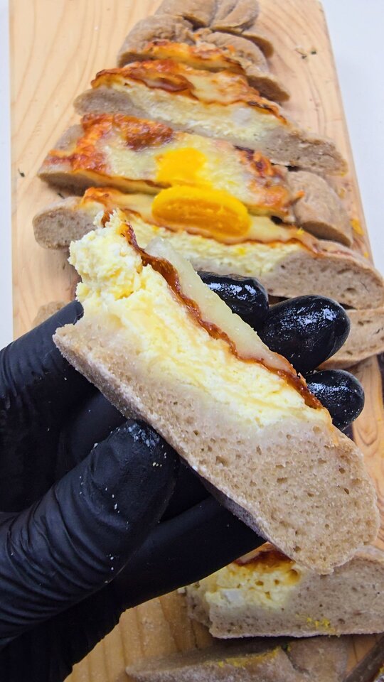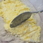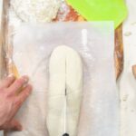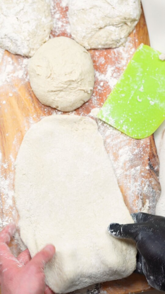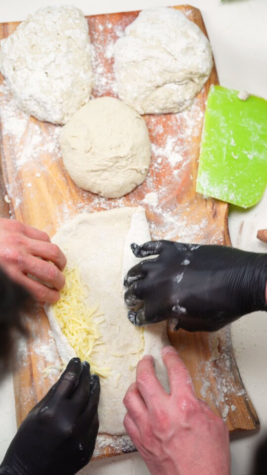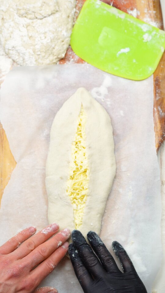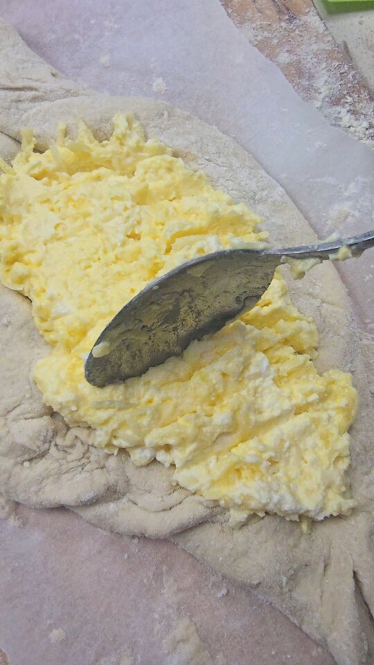 Preheat the oven to 200 °C. Dust the work surface with flour and turn out the dough on it, dividing it into 4 equal pieces. Dust more flour on each of them, transfer the first piece on a sheet of baking paper and roll it out using a rolling pin. You can place a bit of the cheese mixture on the left and right side of the dough, taking each side and placing it over the cheeses, closing the top and bottom. Spread out more of the mixture in the middle of each bread. Optionally, you can also spread the mixture on another piece, closing it up completely, turning it on the other side and cutting it in the middle with a sharp knife, then flattening it. |