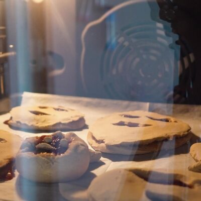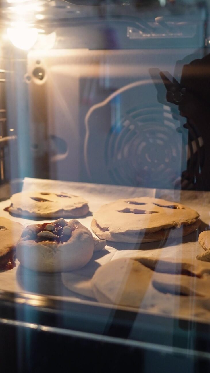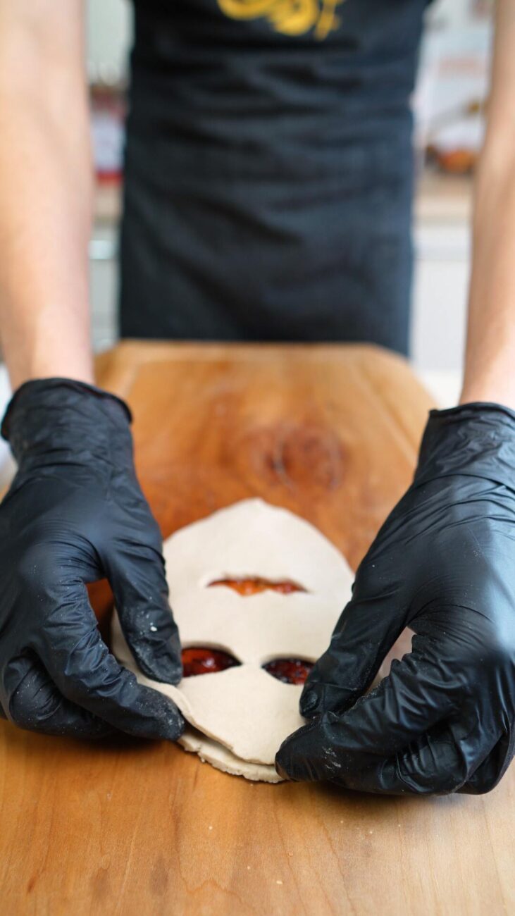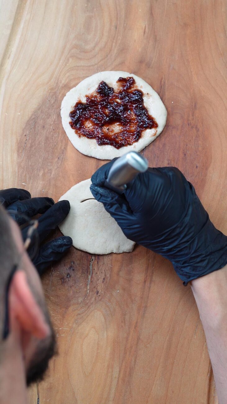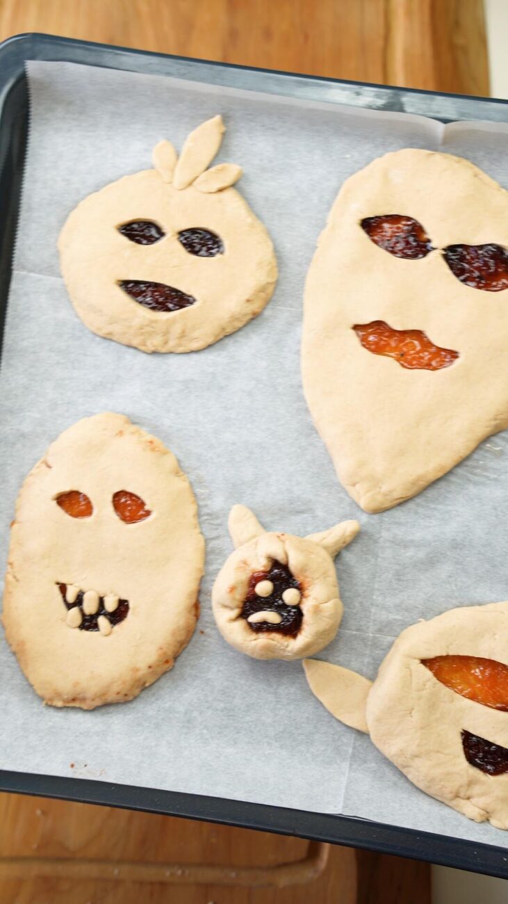 | 2 Gata | Preîncălziți cuptorul la 180 ℃. Rupeți o bucată mică de aluat, pe care o împărțiți în două părți egale și începeți să o modelați în palme, formând biluțe. Apăsați-le ușor cu un făcăleț până obțineți forme uniforme. Întindeți puțină dulceață pe prima bucată, fără a o apropia prea mult de margini. Decupați diferite fețe pe a doua bucată, așezând-o peste prima. Lipiți-le ușor, apăsând marginile. (opțional, înmuiați degetele în apă). |